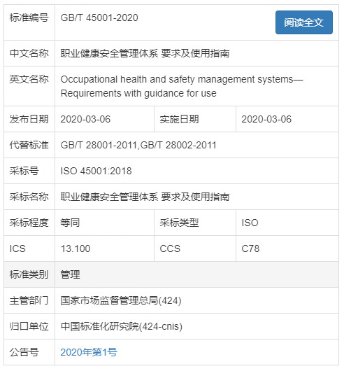 據(jù)國家標(biāo)準(zhǔn)委官網(wǎng)消息,GB/T 45001-2020《職業(yè)健康安全管理體系—要求及使用指南》正式發(fā)布,于2020年3月6日實(shí)施。