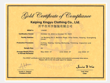 在創思維驗廠網老師專業技術、全程跟進耐心細致輔導以及公司全體員工配合下,一次性順利通過WRAP認證,為將來公司發展奠定了良好的發展基礎,既開拓了市場同時也增加了消費者對公司的信賴,在這里再次祝賀開平市興宇服裝有限公司2022年一次性成功通過WRAP認證,同時也期待未來再次與創思維驗廠網合作!