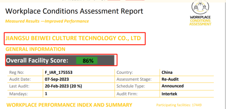 在創(chuàng)思維驗(yàn)廠網(wǎng)老師專業(yè)技術(shù)、全程跟進(jìn)耐心細(xì)致輔導(dǎo)以及公司全體員工配合下,一次性順利通過ITS-WCA驗(yàn)廠,為將來公司發(fā)展奠定了良好的發(fā)展基礎(chǔ),既開拓了市場同時(shí)也增加了消費(fèi)者對(duì)公司的信賴,在這里再次祝賀江蘇百威文化科技有限公司2023年一次性成功通過ITS-WCA驗(yàn)廠,同時(shí)也期待未來再次與創(chuàng)思維驗(yàn)廠網(wǎng)合作!